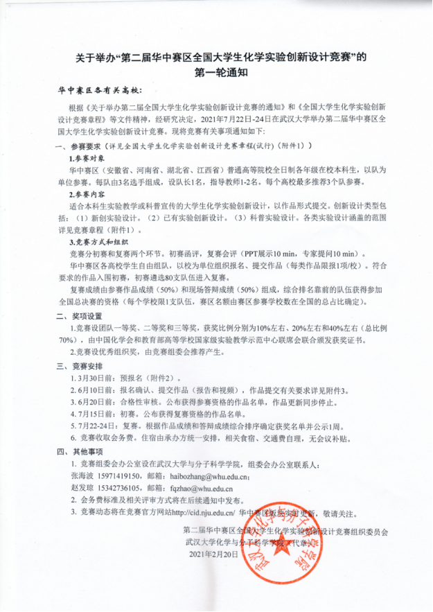 2.6月10日前:报名确认、提交作品(报告和视频),作品提交要求详见附件2《第二届华中赛区全国飞禽走兽 生化学创新实验竞赛(第一轮通知盖章扫描版)》