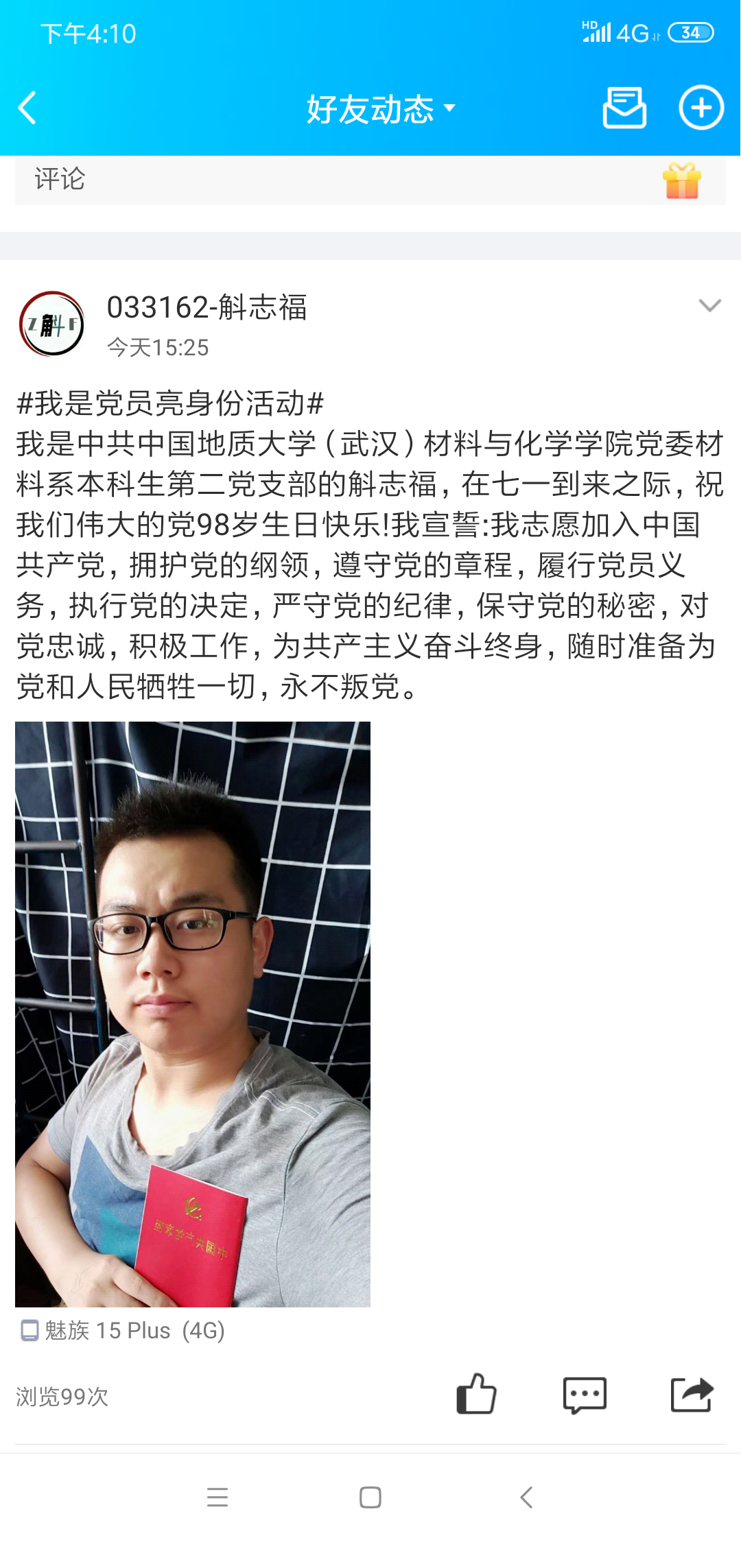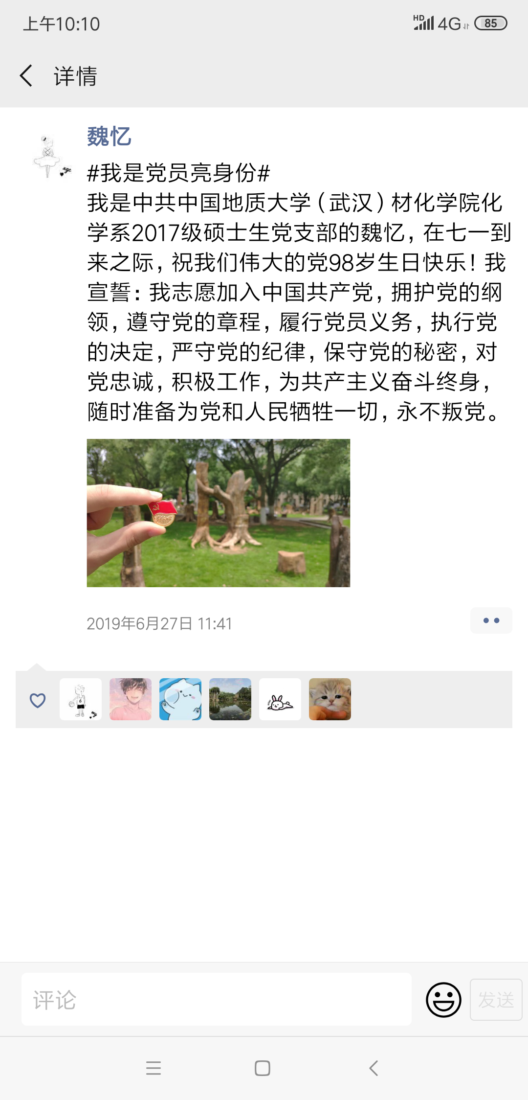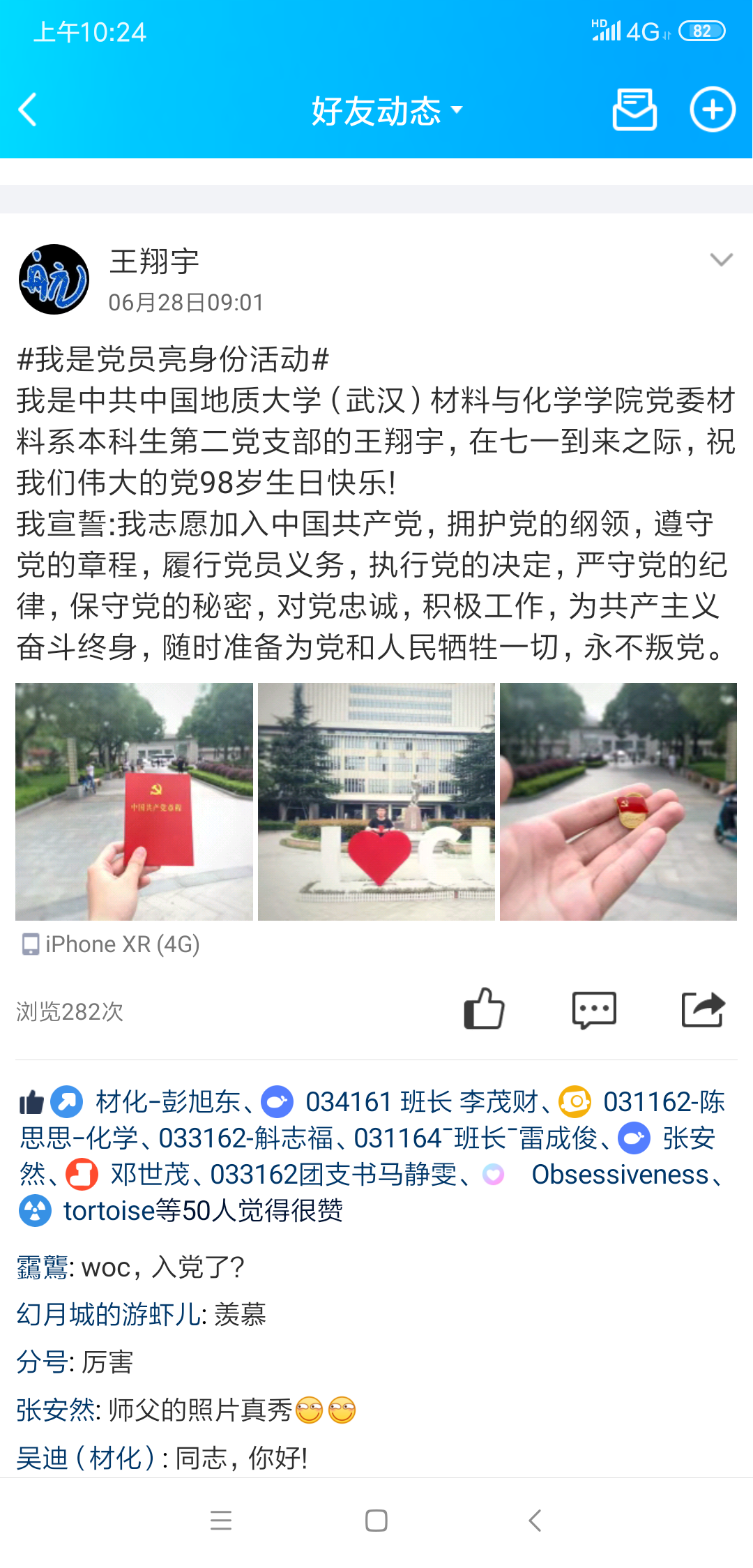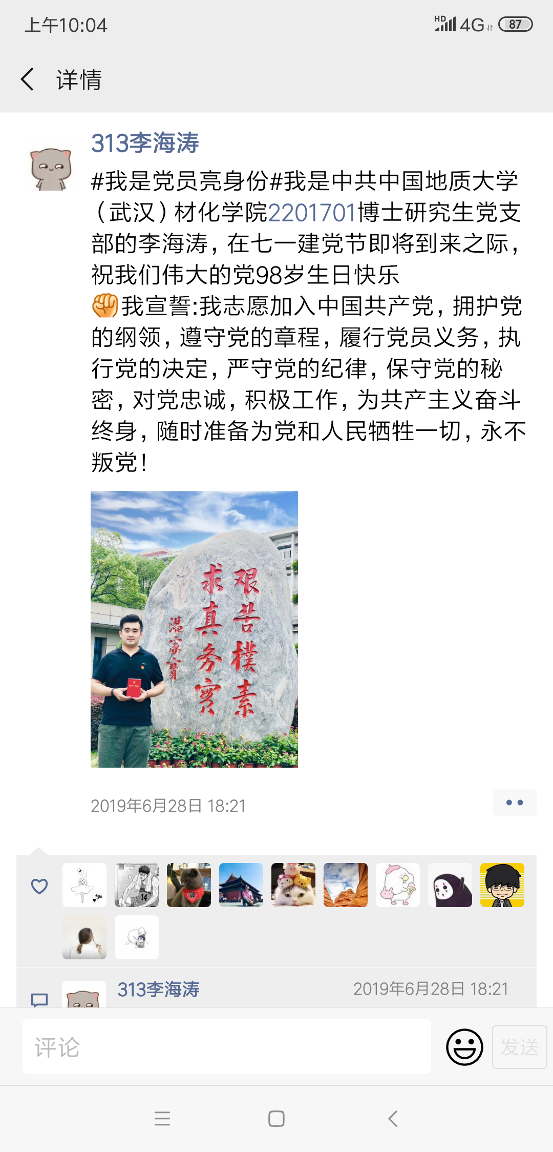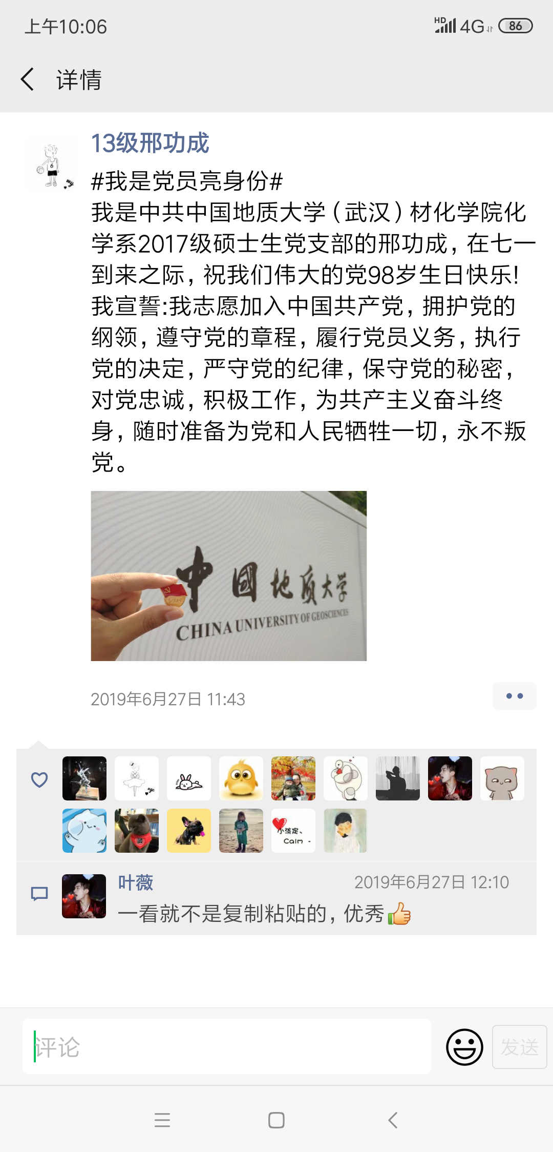 材料系18级硕士生党支部的田硕,在七一到来之际,祝我们伟大的党98岁生日快乐!我宣誓:我志愿加入中国共产党,拥护党的纲领,遵守党的章程,履行党员义务,执行党的决定,严守党的纪律,保守党的秘密,对党忠诚,积极工作,为共产主义奋斗终身,随时准备为党和人民牺牲一切,永不叛党。”研究生党员田硕同志在个人QQ空间里发布了一条这样的说说,立马引发很多同学关注,同学们纷纷给说说点赞。当天晚上材化飞禽走兽