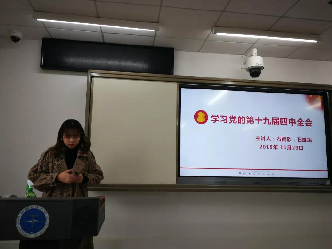 随后,由冯雨欣同志和石璐瑶同志带领支部党员一起学习党的十九届四中全会精神。他们主要从“会议总览”、“中国特色社会主义制度和国家治理体系的显著优势”、“坚持完善中国特色社会主义制度、推进国家治理体系和治理能力现代化的总体目标”、“坚持完善中国特色社会主义制度、推进国家治理体系和治理能力现代化的具体路径”四个方面带领大家学习了十九届四中全会的重点内容。会后,他们提供了PPT供支部党员继续深入学习。