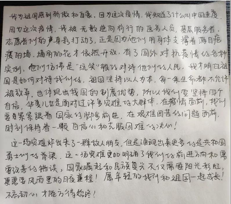 033182团支部王亚松:爱国是最大的责任担当,中国青年则是爱国担当的主力军。在此次新冠疫情中,90后和00后已然成为抗击疫情的主力军,在此次疫情下青年也能重新认识中国,明白自己的时代责任与担当。新时代的青年应当胸有大志,心有大我,肩有大任,行有大德,努力成为社会主义合格的建设者和接班人。