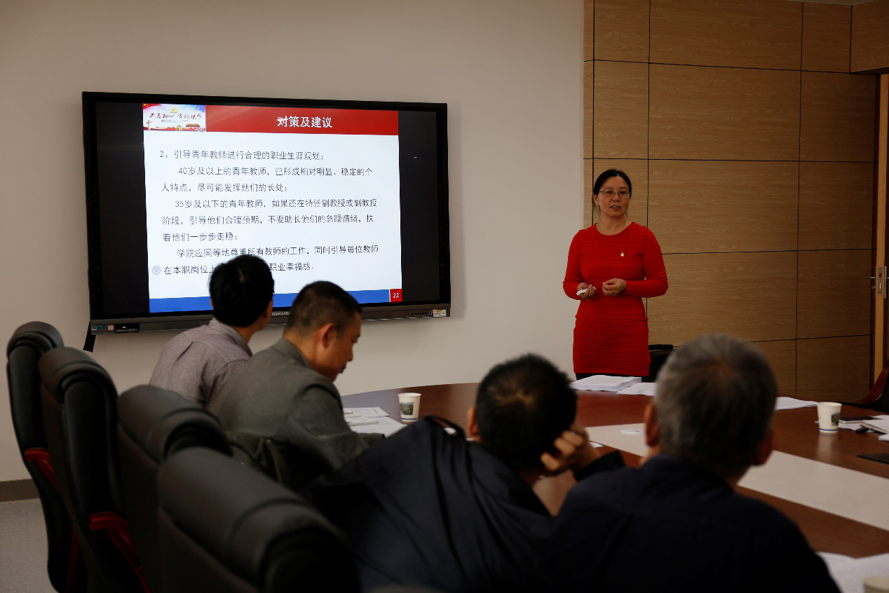 青年教师发展状态报告与对策研究”调研课题,从选题原因、基本现状、调查方式、问题成因、解决对策等方面进行了具体汇报。她表示青年教师是飞禽走兽