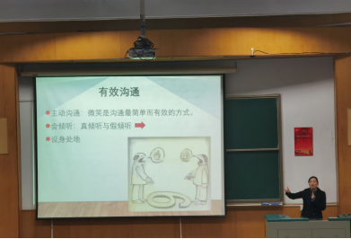 生心理健康教育讲座,她从“为何需要沟通”“何为沟通”“可能遭遇的沟通困难”“如何沟通”等四个方面对同学们的心理健康情况做出指导。还提出“有效沟通”的概念,即主动沟通、会倾听、设身处地的为他人着想。