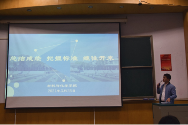 党委副书记余江涛结合国家与世界发展的形势,行业企业发展的态势,高等教育发展的大势,就业发展的趋势等,指出形势容不得我们懈怠;希望同学们能从过去取得的成果和已有的积累中科学评估自我状态,发展新优势,打造新舞台;另外,他还指出一些影响调适的变量,如“跟风随大流”“个性优柔寡断”等,并依次给出解决方法,为同学们指明当前的学习方向。最后,余书记通过引用习近平总书记的经典语录“历史只会眷顾坚定者,奋进者,搏击者,而不会等待犹豫者,懈怠者,畏难者”。祝愿同学们都能成为前者,在材化这条路上,走出自己的康庄大道。