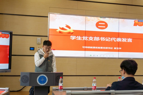 可持续能源实验室支部书记谢玉华作为学生党支部书记代表发言。他介绍了所负责的支部对党史学习教育活动安排,表示将通过专题学习、党史知识测试、参观红色景点、阅读红色书籍、观看红色影视剧等方式将党史学习“学在日常,学在实处”,切实达到教育实效。