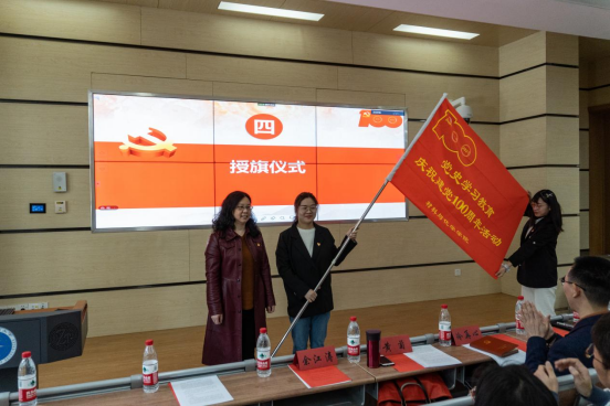 党委书记黄菊向学生代表授旗,学生代表庄重地接过了“党史学习教育 庆祝建党100周年活动”的大旗。