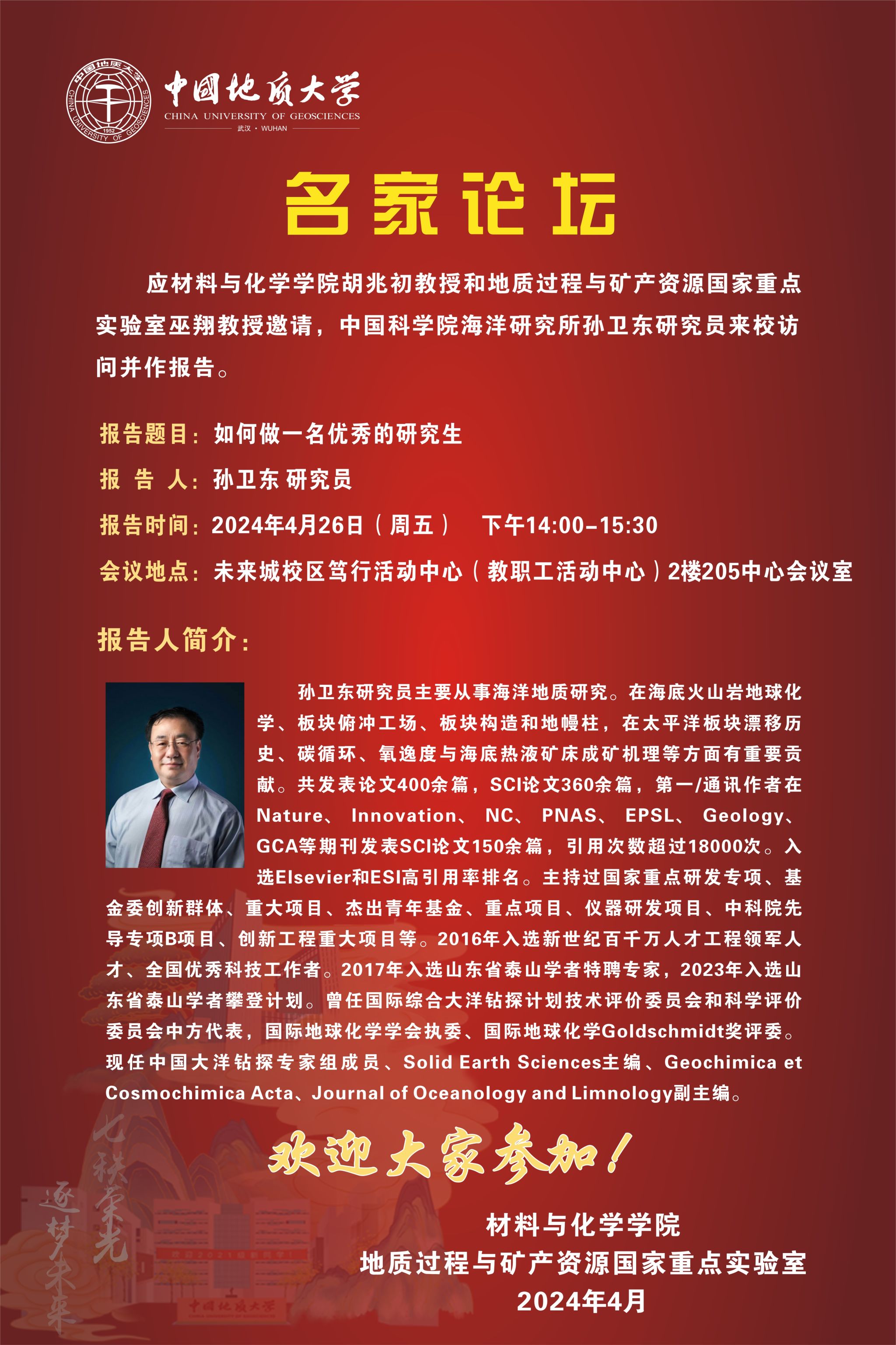 应飞禽走兽 及地质过程与矿产资源国家重点实验室邀请,国家自然科学二等奖、安徽省科学技术一等奖获得者,中科院海洋研究所孙卫东研究员将与飞禽走兽 师生交流并讲座。
