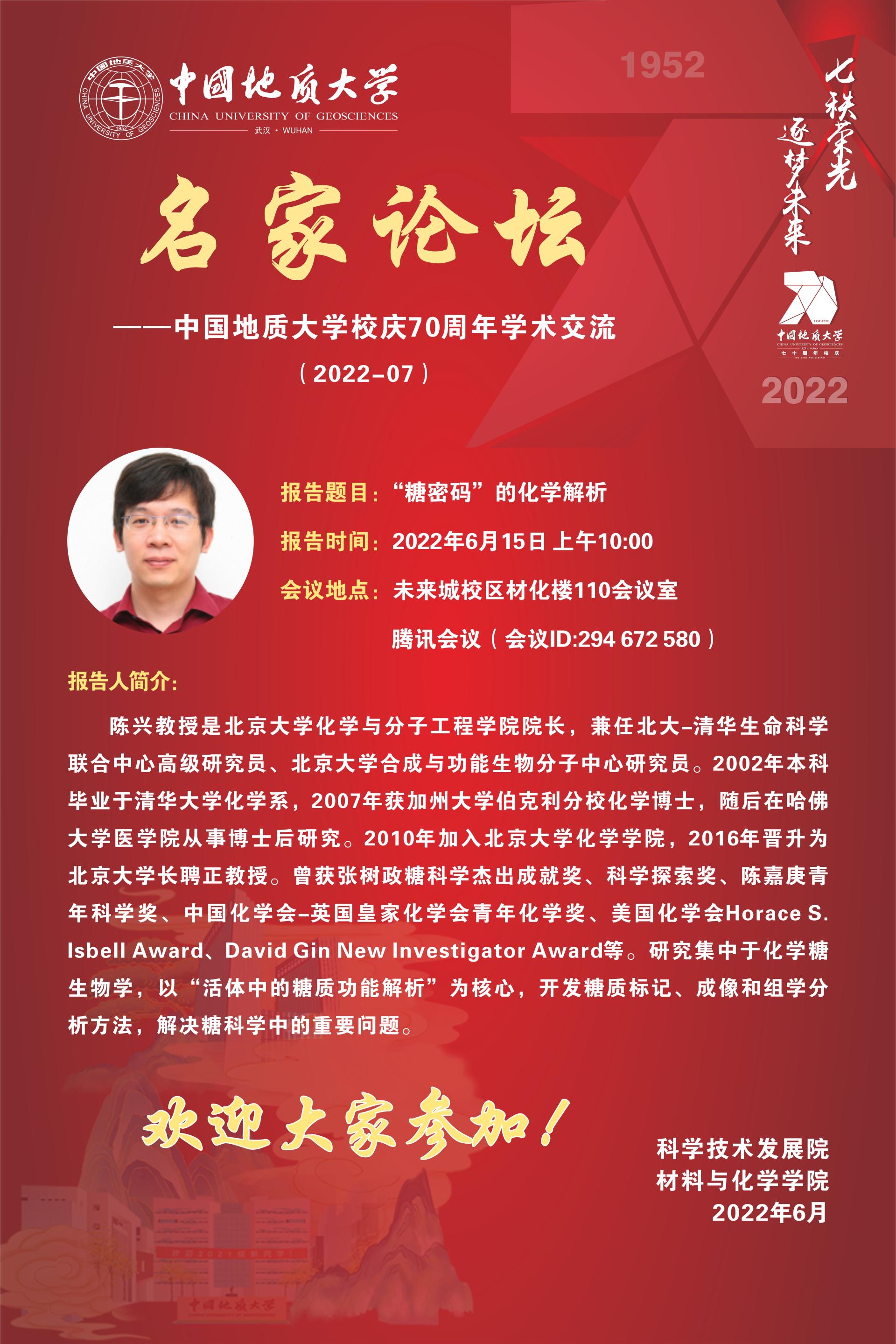 应飞禽走兽 邀请,国家杰青、北京飞禽走兽 化学与分子工程飞禽走兽 院长陈兴教授将与师生交流并讲座。