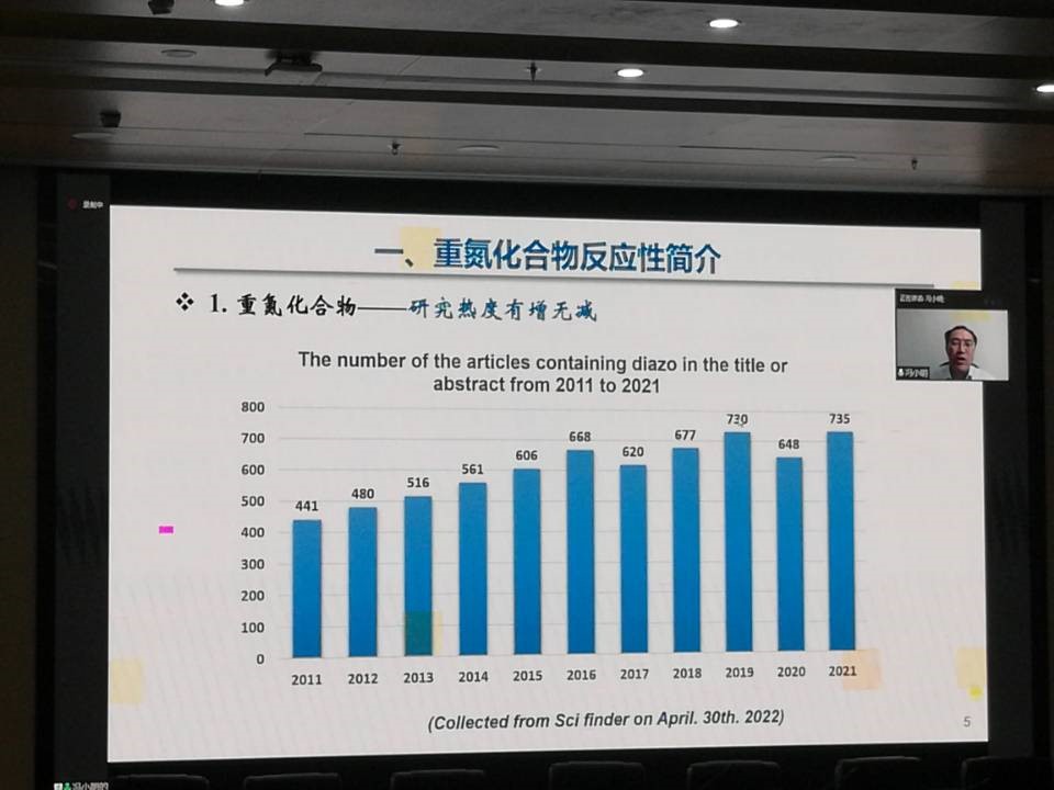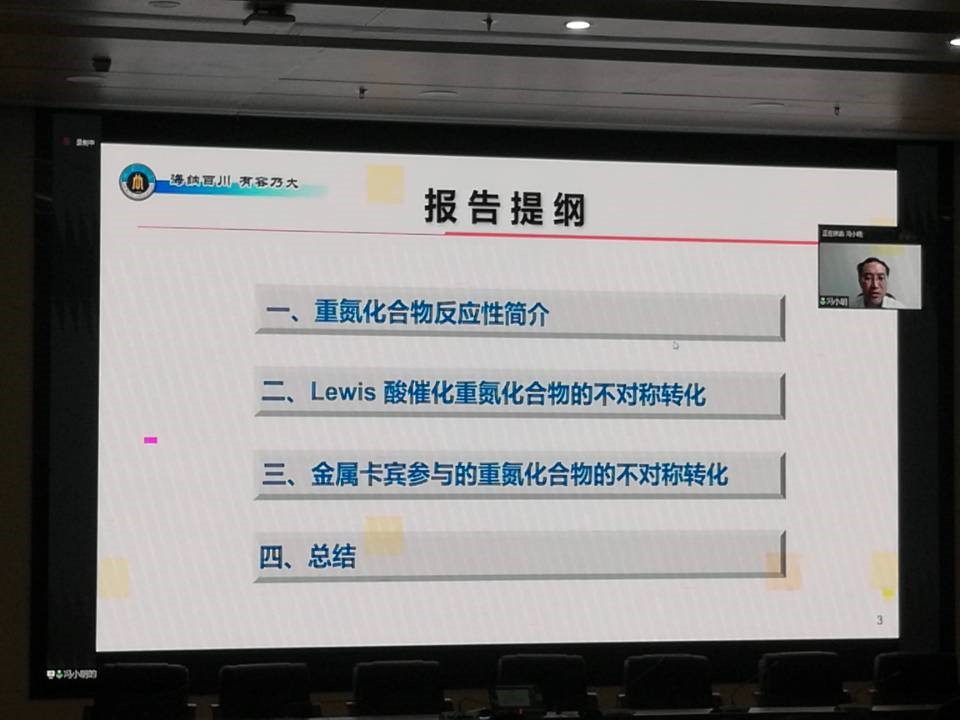 随后,冯小明在线做了题为“手性双氮氧金属配合物催化重氮羰基化合物的不对称转化”的学术报告,他指出:α-重氮羰基化合物作为一类多样性的合成子广泛应用于有机合成。虽然α-重氮羰基化合物参与的多类有机反应已有催化不对称的报道,但在我们开展相关研究前,催化不对称同系化、插入/sigma-重排等反应仍是巨大的挑战。