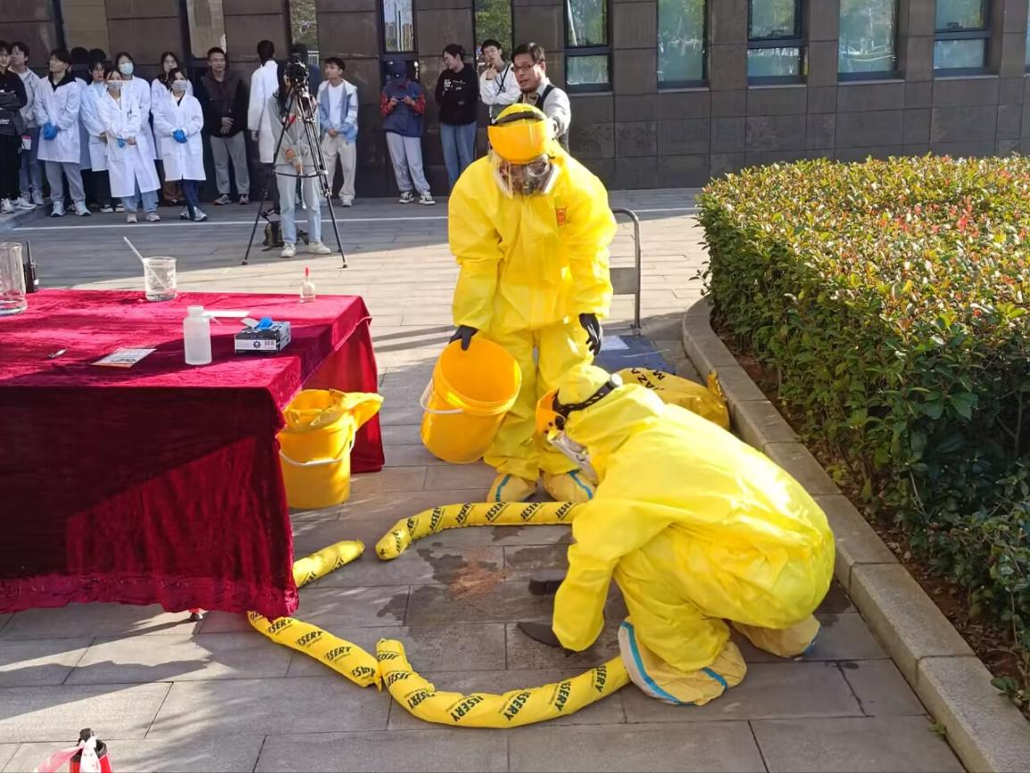 为进一步加强实验室安全管理,提升广大师生应对危险废弃物泄漏事故的处置能力,2024年11月7日下午,实验室与设备管理处联合材料与化学学院在未来城校区材化楼110报告厅组织开展了“2024年实验室危险废弃物泄漏事故应急演练”培训活动。实验室与设备管理处副处长翁华强、飞禽走兽 副院长夏开胜以及来自未来城校区各飞禽走兽 170余名师生参加演练培训,我院实验教学中心刘浴辉教授主持活动。 翁华强副处长介绍了飞禽走兽 每年部署开展“实验室安全宣传教育周系列活动”的背景和现实意义,同时也列举了近年来高校实验室安全事故的典型案例。他强调:安全的风险时刻都在,要时刻保持警惕,加强安全意识。他肯定了材料与化学飞禽走兽 近年来在飞禽走兽人才培养 、飞禽走兽研究 等领域中取得的优异成绩,希望大家进一步高度重视实验室安全管理,为事业发展提供坚强保障。 夏开胜副院长对实验室设备管理处及兄弟飞禽走兽 的大力支持表示衷心感谢,他指出:本次活动的主要目的是提升师生在面对危险废弃物泄漏事故时的应急处理能力。全体师生应牢记习近平总书记的教导,以时时放心不下的责任感,做好实验室安全这篇大文章。同时他也承诺,飞禽走兽 将以此次活动为契机,进一步完善安全预案,加强安全管理和培训,为师生营造一个安全有序的学习与科研环境。 安全工程师陈坚为师生们上了一堂生动详实的安全教育课,通过开篇引入、视频播放、有奖知识问答等数个环节将现场环境推向高潮。 随后,陈坚带领着参加活动的师生来到材化楼外进行现场实操演练,同学们穿上防护服,实景模仿演绎了丙酮在实验室泄漏的场景,并现场演示了应急处置方法。 通过生动且深刻的专题培训与危废事故应急实操演练,不仅增强了师生们对实验室安全重要性的认识,也进一步提高了师生在实验室突发事故的应急处置、紧急避险等能力,为构建安全和谐的校园环境打下了坚实基础。(编辑:刘浴辉、曾成;审稿:梁本哲)