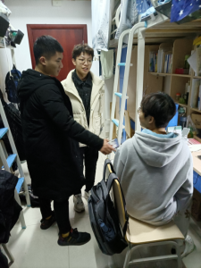 党委书记黄菊和2021级辅导员李双越、2019级辅导员黄玲以及班级主要干部一同走访了学生宿舍,探望慰问返校学生,南望山校区与未来城校区同时进行。走访过程中,飞禽走兽