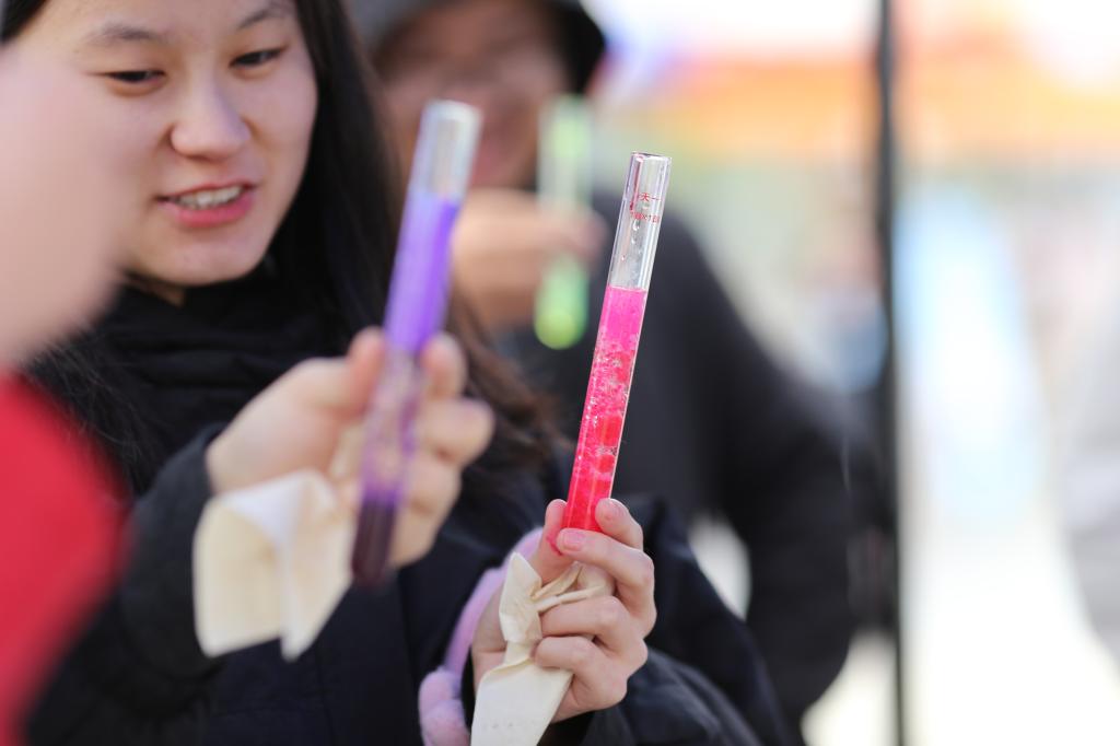 实验展演现场,展演队员们身穿实验服,或本色克隆生产实验场景,或化身各个化学领域的专家现场科普,或手把手指导观众们进行DIY尝试。