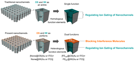 夏帆教授团队的最新研究成果——《纳米孔道截然不同的功能元素:外表面功能分子抗干扰,内表面功能分子离子门控》。研究成果将纳米尺度的孔道材料进行了精细的功能分区,并实现了单一孔道的双重功能化,为纳米限域空间内加工技术,表征技术和分区域功能化技术提供了新的研究思路。