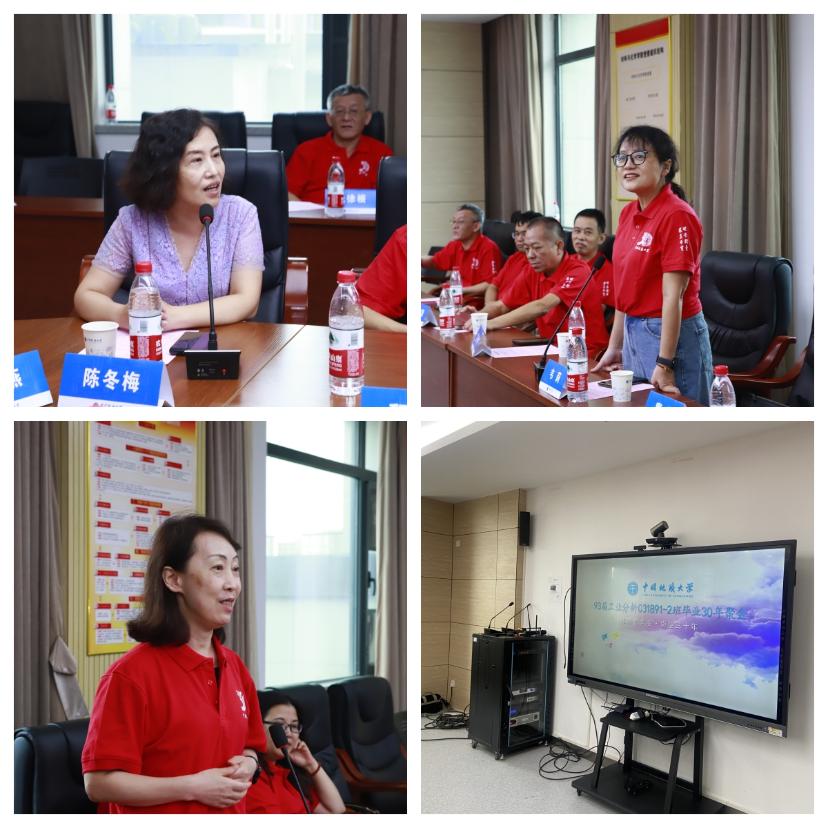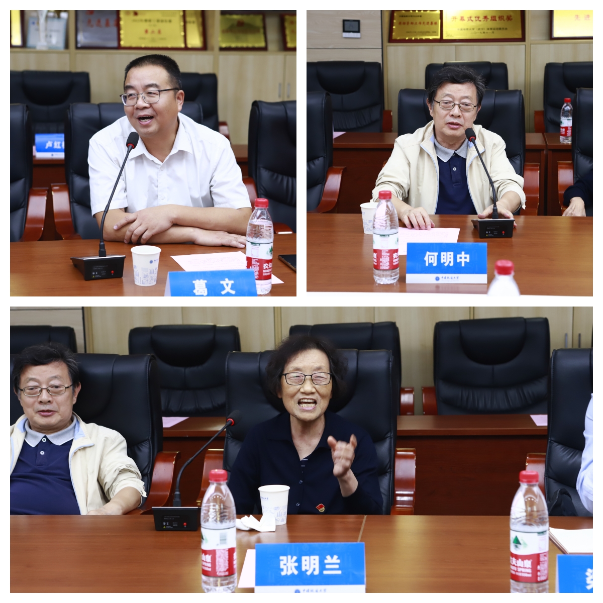 89级辅导员陈文武,老教师代表、时任应用化学系党总支书记张明兰,老教师代表、时任031892班班主任何明中,材化飞禽走兽