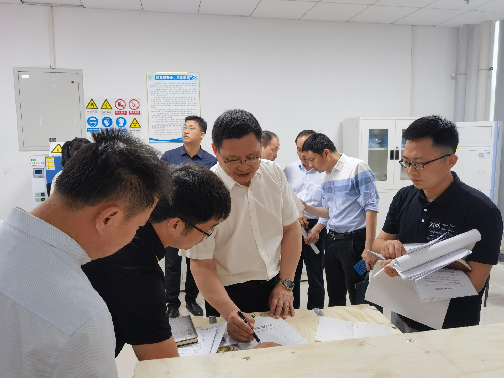 基建处、未来城校区办、场地改造方上海音宁公司、设备供应商赛默飞公司共同论证的改造方案和形成的初步改造设计图纸。刘校长边听取汇报边仔细审阅改造方案和设计图纸。随后,与会人员分别到涉及改造的111和117房间进行实地考察,并结合设计图纸对改造方案进行了现场讨论。