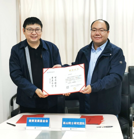 教育发展基金会秘书长陈华荣与高山院士研究团队代表李明老师签署捐赠协议。